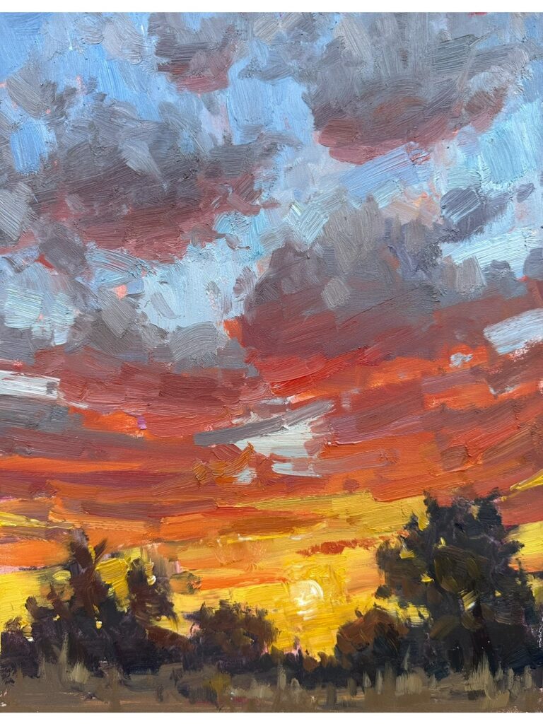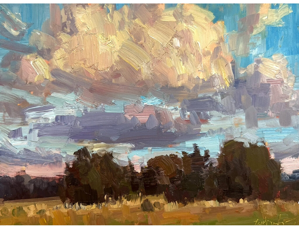 “Sunset Field” 9×12″ Oil on Gessobord | $650 | Available at Wilde Meyer Galleries