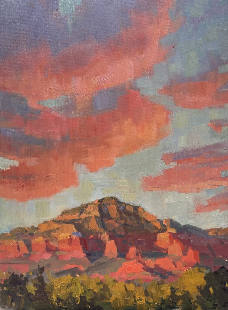 “Thunder Mountain Sunset” 24×18″ Oil on Canvas | $2200 | Available Mountain Trails Gallery Sedona