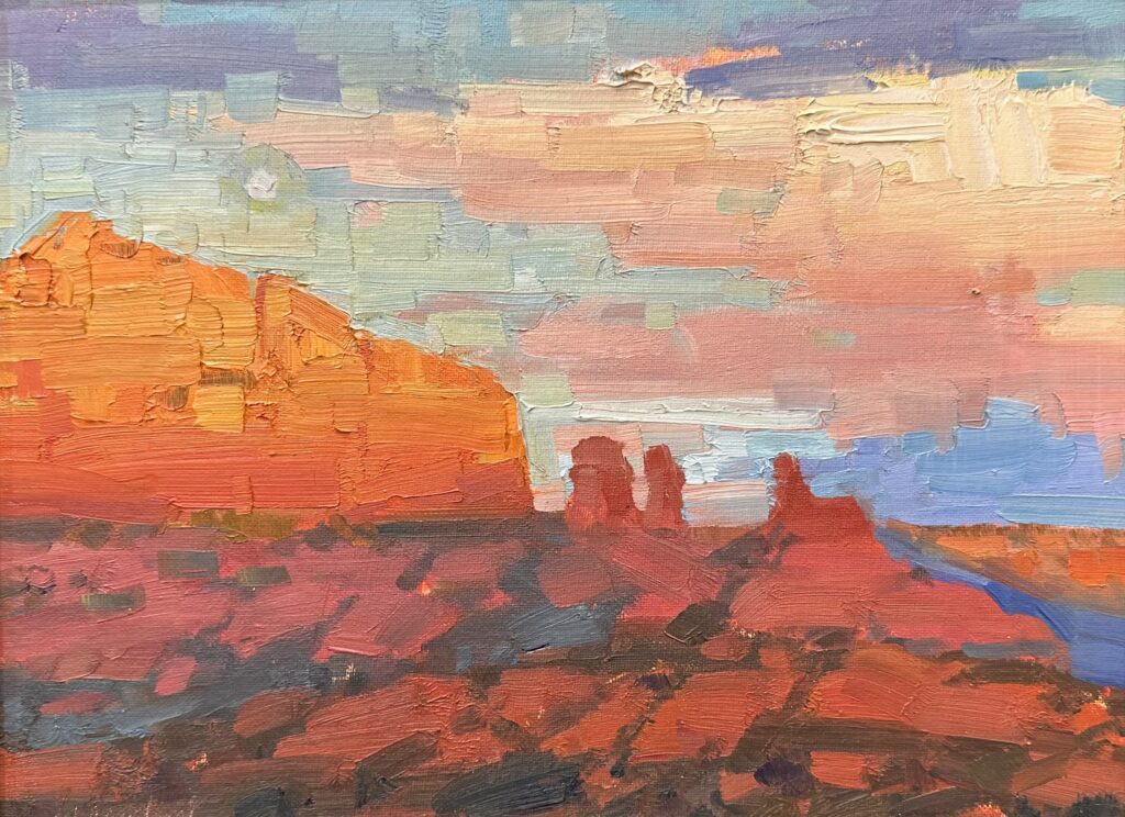 “Red Rocks and Setting Sun” 12×24″ Oil on Canvas | $1750 | Available at Mountain Trails Sedona